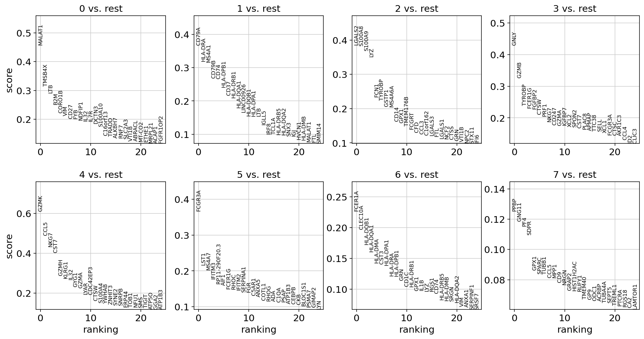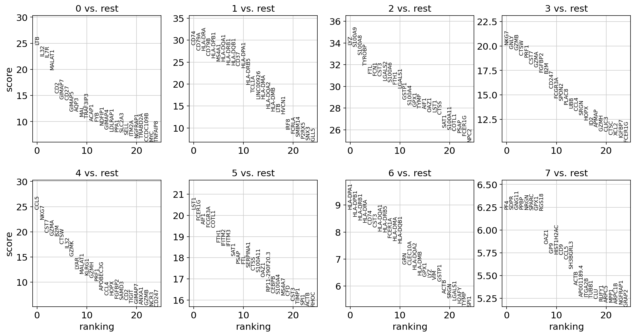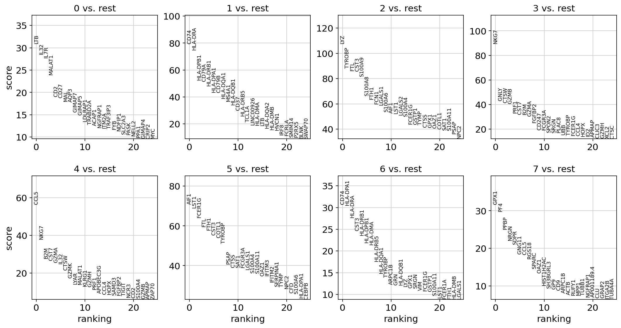 0 LTB CD74 LYZ NKG7 CCL5 LST1 HLA-DPA1 PF4