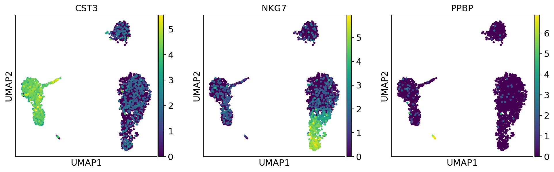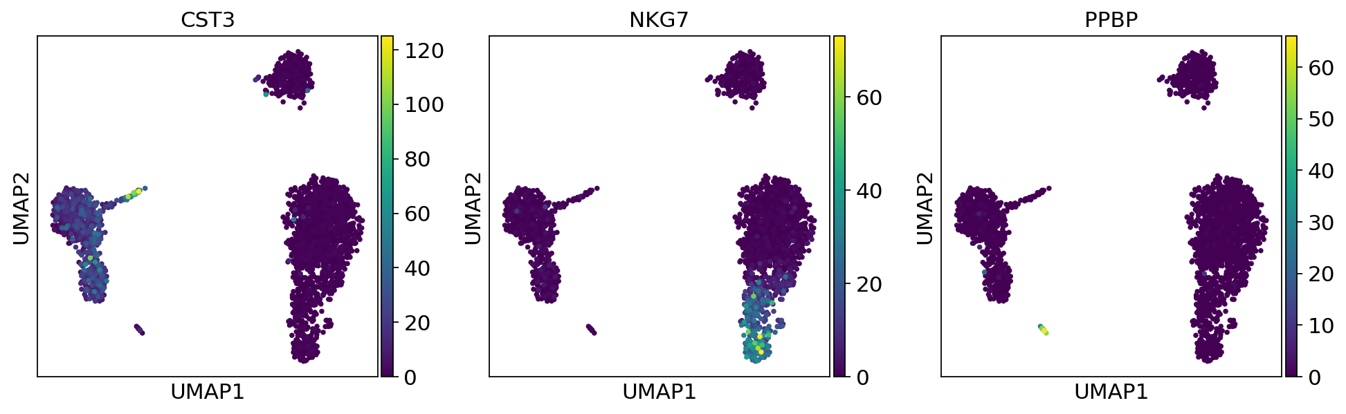 3 MALAT1 4.433395e-88 CD79B 1.868216e-154 TYROBP 1.259221e-223 CTSW 5.115917e-81 GZMA 6.896869e-83 FCGR3A 2.609486e-84 HLA-DRA 6.528837e-17 PPBP 4.744938e-10