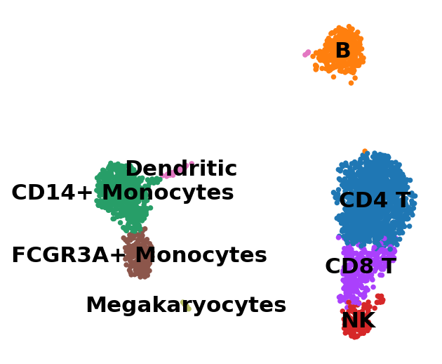 sc.pl.umap(adata, color="leiden", legend_loc="on data", title="", frameon=False)