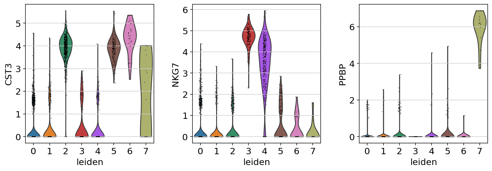 sc.pl.violin(adata, ["CST3", "NKG7", "PPBP"], groupby="leiden")