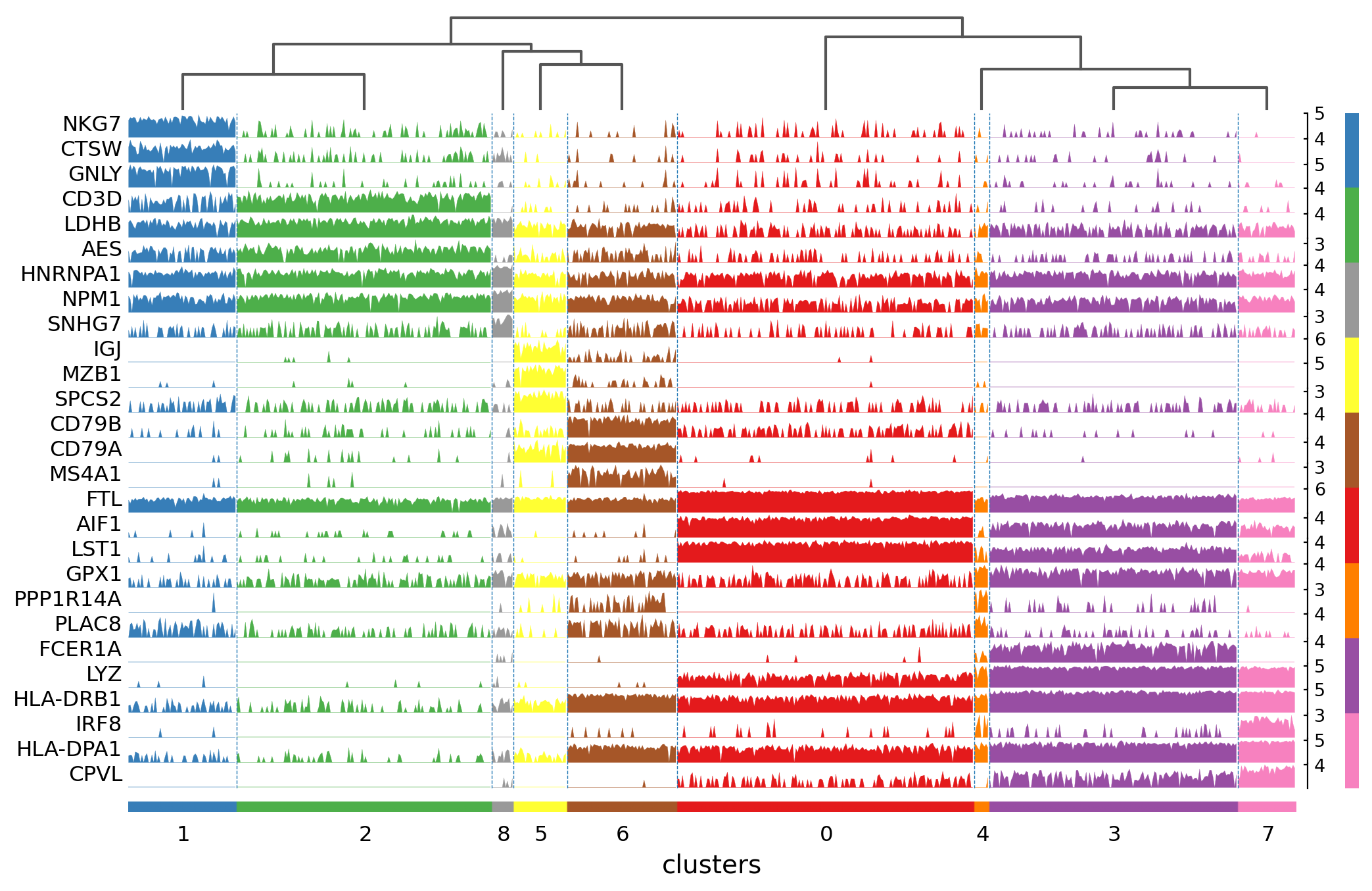 The track plot shows the same information as the heatmap, but, instead of a color scale, the gene expression is represented by height.