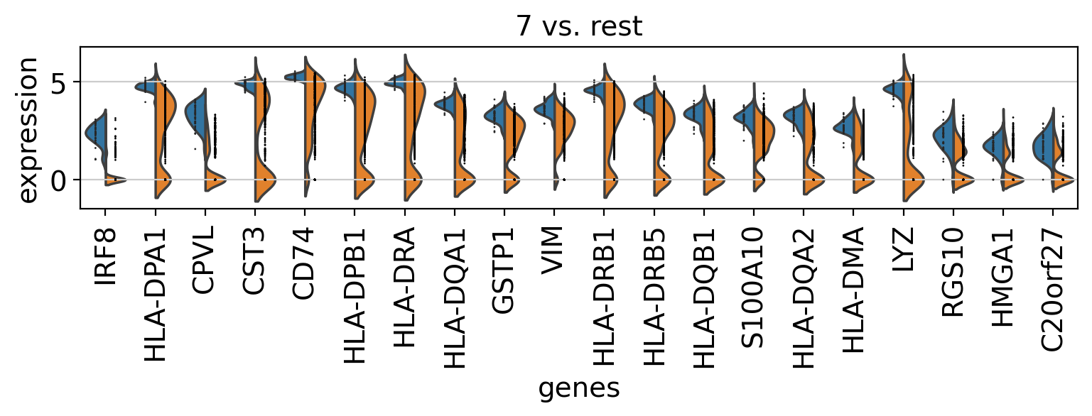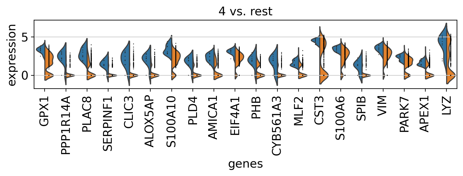 In scanpy, is very easy to compare marker genes using split violin plots for all groups at once.