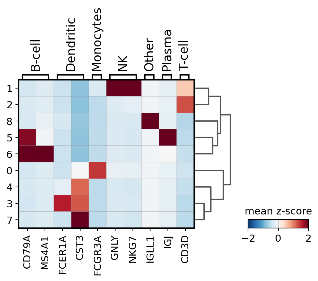 A simple way to visualize the expression of genes is with a matrix plot. This is a heatmap of the mean expression values per gene grouped by categories. This type plot basically shows the same information as the color in the dotplots.