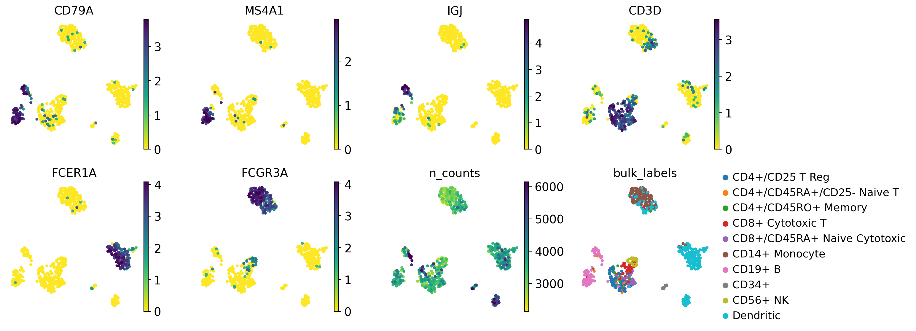 Using this plot, we can see that cluster 4 correspond to B-cells, cluster 2 is T-cells etc. This information can be used to manually annotate the cells as follows: