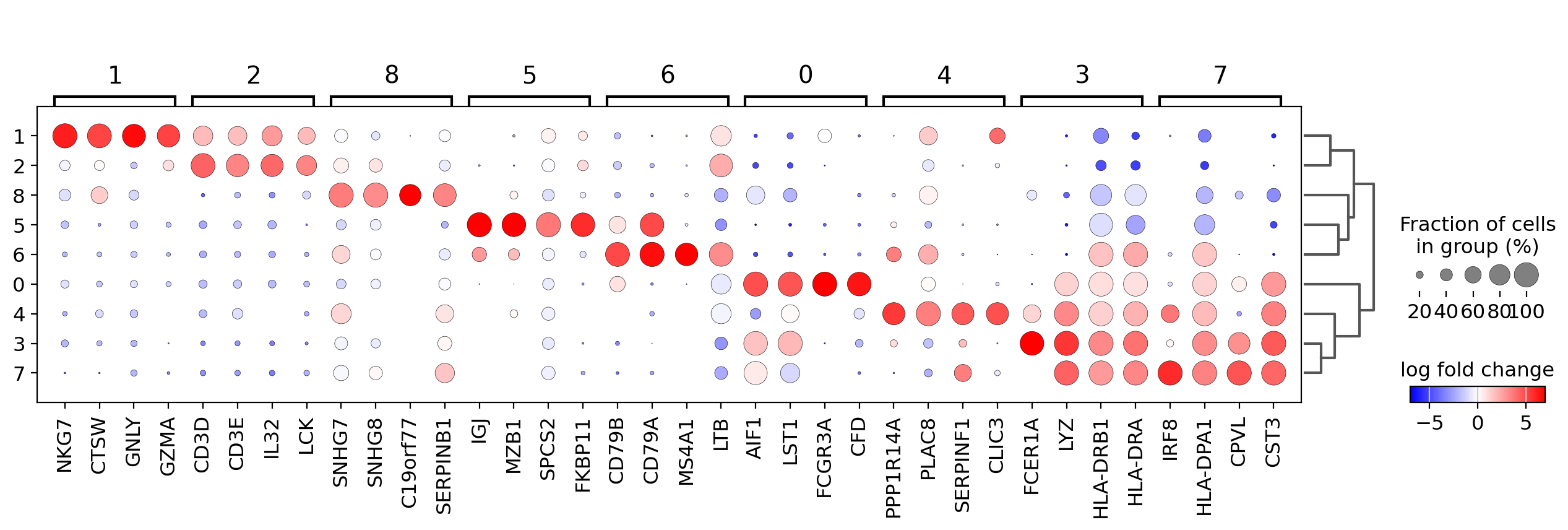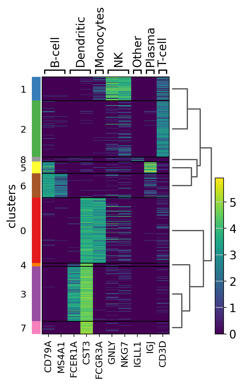 Also, it is also useful to add a dendrogram to the graph to bring together similar clusters. The hierarchical clustering is computed automatically using the correlation of the PCA components between the clusters.